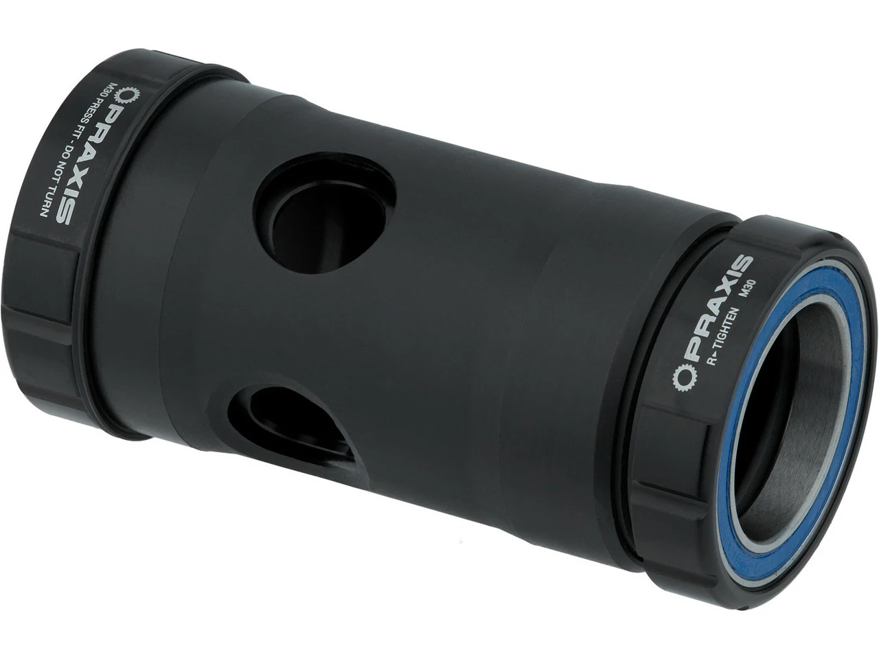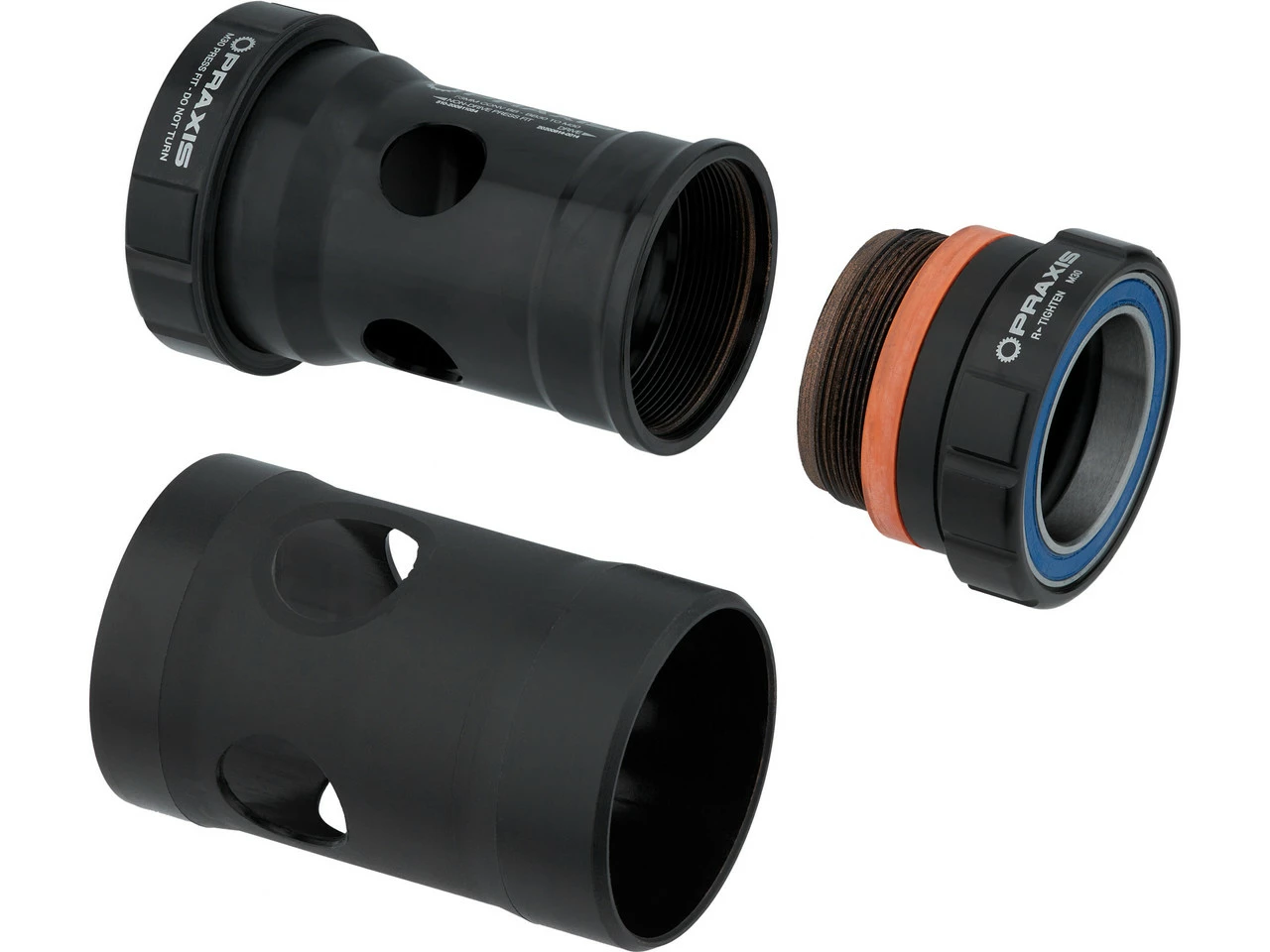 Mit dieser patentierten Praxis Works Technologie werden nicht nur alle Toleranzen der Rahmenhersteller neutralisiert, sondern es wird auch eine erhöhte Lebensdauer gewährleistet. Bei Praxis Collet Innenlagern wird die Nicht-Antriebseite eingepresst und dann die Antriebseite darin verschraubt. Beim Verschrauben spreizt sich das Lager bis zu einer definierten Endposition, welches dem jeweiligen Pressfit entspricht, und sitzt fest, ohne Geräusche zu machen. Außerdem wird in Antriebsrichtung ein oranger Elastomer-Gummiring komprimiert, der sich dann wiederum zum Rahmen hin ausdehnt und das Lager dadurch noch einmal zusätzlich verklemmt. Das Elastomer-Material gleicht Toleranzen aus und puffert zugleich eventuelle Knackgeräusche weg.