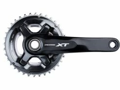 Die Shimano XT FC-M8000-B2 Kurbelgarnitur ist eine Variante der FC-M8000-2 mit 3 mm weiter außen liegender Kettenlinie. Sie kann daher nur in Rahmen mit 148 mm Einbaubreite hinten verwendet werden. Die Aluminium-Kurbel ist mit zwei Kettenblättern in der Abstufung 24-34 oder 26-36 Zähne bestückt. Sie wurde im Hinblick auf Übersetzung und gleichmäßigen Tretrhythmus optimal abgestimmt (Dyna-Sys11 Technologie), wobei das seit vielen Jahren bewährte Hollowtech II Design mit fest verbundener 24 mm Achse für ein ausgewogenes Verhältnis von Steifigkeit und Gewicht sorgt.