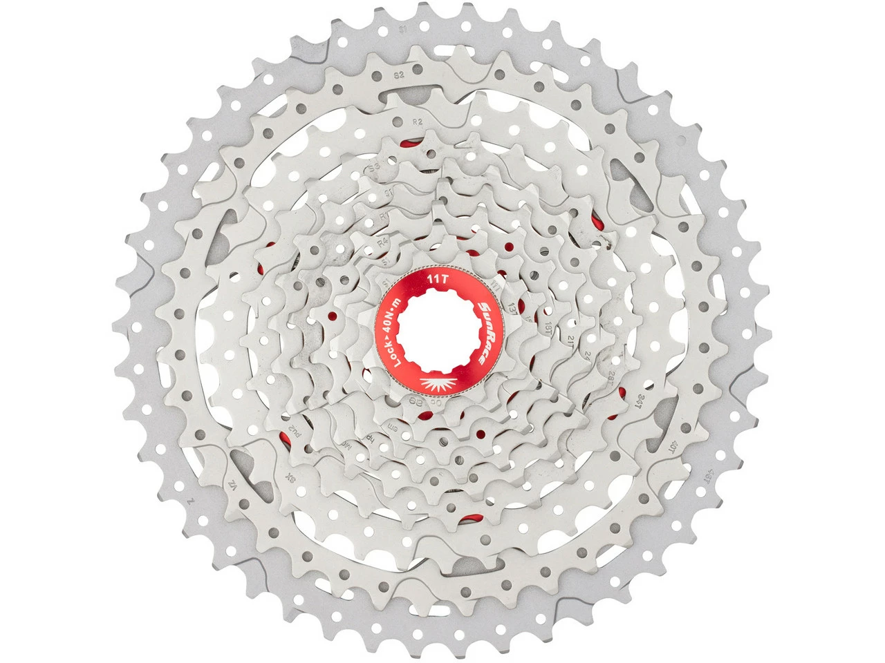 Mit der SunRace CSMX3 Kassette schaltest Du dank Fluid Drive Plus™ Technologie jederzeit sauber und zuverlässig. Sie zeichnet sich durch eine große Bandbreite aus (11-40, 11-42, 11-46 10-fach) und durch das charakteristische Loch-Design, welches Gewicht einsparen hilft. Die Ritzel 1 bis 9 sind aus Stahl, das größte Ritzel besteht aus Aluminium. Dazwischen sitzen zwei Spider, die genauso rot eloxiert sind wie der Abschlussring der CSMX3.